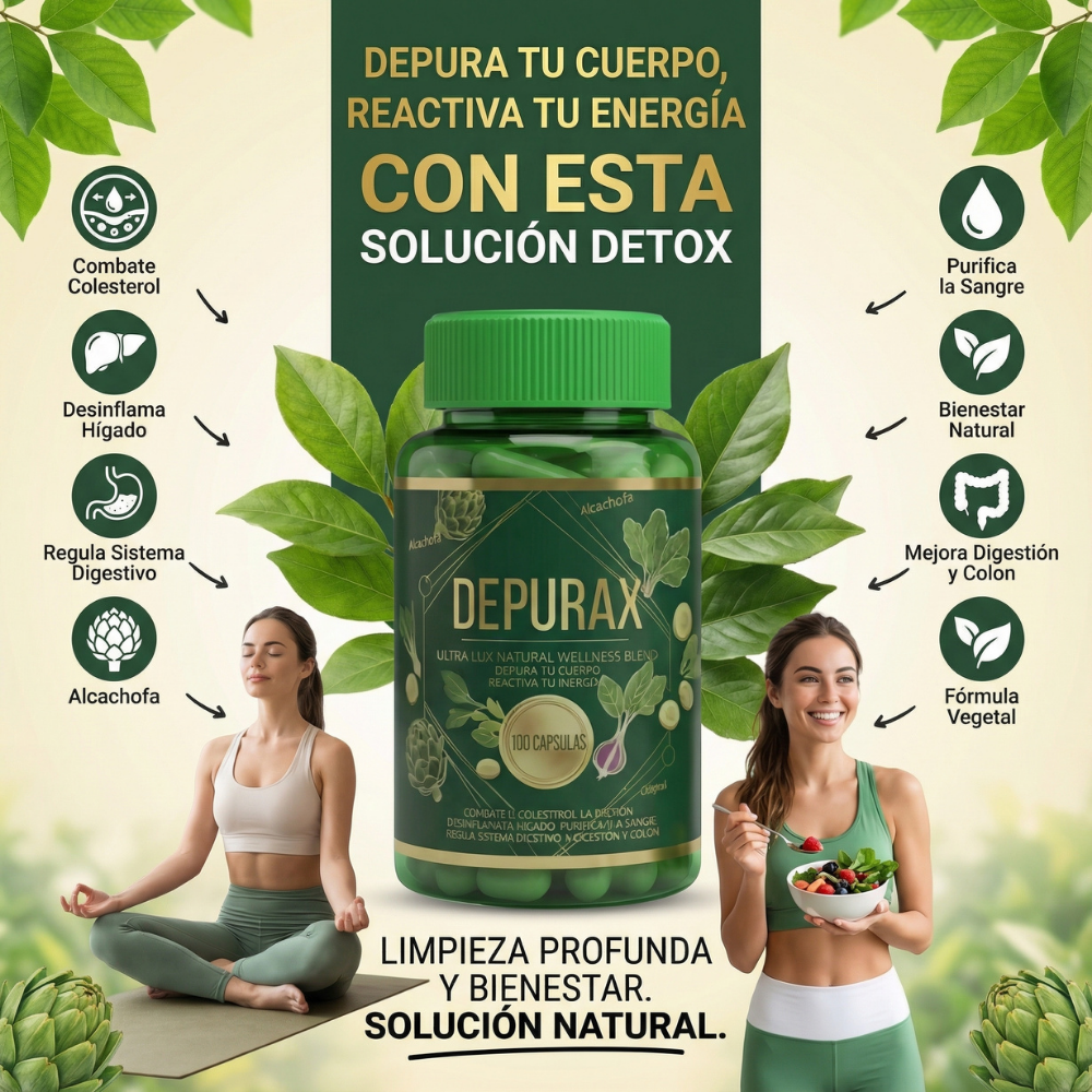 DEPURAX es un suplemento nutricional formulado para apoyar la salud digestiva y la depuración interna desde adentro. Su fórmula ayuda a mejorar la digestión, reducir la inflamación y favorecer la eliminación de toxinas acumuladas, contribuyendo a que te sientas más ligero y equilibrado en tu día a día.