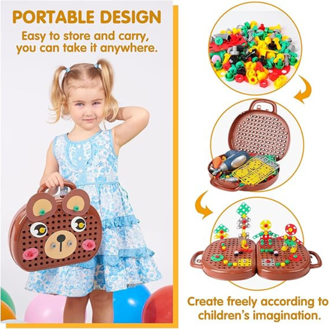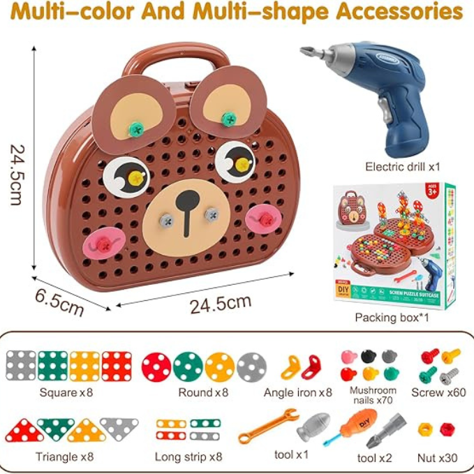 El juego incluye una variedad de herramientas, como un taladro eléctrico, tornillos y bloques de construcción, que permiten a los niños ensamblar y desarmar diferentes estructuras.